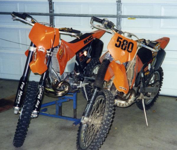 | I enjoyed the sight of two KTM's in my garage but eventually sold the bike on the right, the '99 300EXC, in May 2003. KTM updated the forks with 43mm WP's in 2000, which were very light compared to the massive 50MM WP's on the '99 EXC. What the MXC forks gave up in weight, they gained in harshness. Some of the sharp rocks the EXC would float over were bone-jarring impacts on the MXC. Eventually I bought a do-it-yourself revalve hit for the MXC and the fork action improved quite a bit. KTM's from this era were notoriously finicky with carburetor jetting, and these two bikes were no exception. The MXC jetting baffled me. I never did find a setting that would prevent engine knock without using race gas, which I did for most of the 2003 season. Then I found a guy named Clay Wolfe at C&M Machine, who had done some work with engine tolerances on KTM's. Turns out the specified tolerances weren't being consistently applied in the manufacturing process, making it nearly impossible for all engines to be jetted exactly alike. Off went the MXC's cylinder head to Clay, who machined it to correct tolerances. After that, no more race gas. A year or two later KTM finally improved its manufacturing processes and I now hear much less about wide variations in jetting. Other differences in the two KTM's were minor. Back then, the MXC and EXC models were somewhat similar in purpose to today's XC and XC-W lines, respectively. The MXC had motocross-like gear spacing in its transmission, while the EXC had a wide-ratio transmission. To keep up with the wide-ratio, big-bore 4-strokes I was racing against in the Missouri Hare Scrambles series, I ran a 14/50 sprocket combo (14/52 was stock). This worked fairly well in wider, GNCC-type trails but was a handful in Illinois-style woods. Only the lugging power of that sweet 300 motor made it workable. The 300MXC was sold in January 2008; the 300EXC in May 2003. Both KTM's were great for long races where I could be lazy late in the race and conserve energy. In Colorado in 2006 and 2007, the MXC was perfect. |