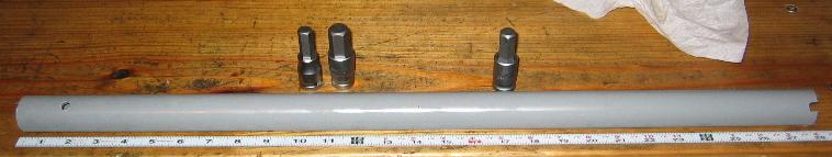 You can get by with about 10 inches shorter. The hex socket on the right is 14mm, for use at the compression valve cap. The other two came with the Auto Zone set.